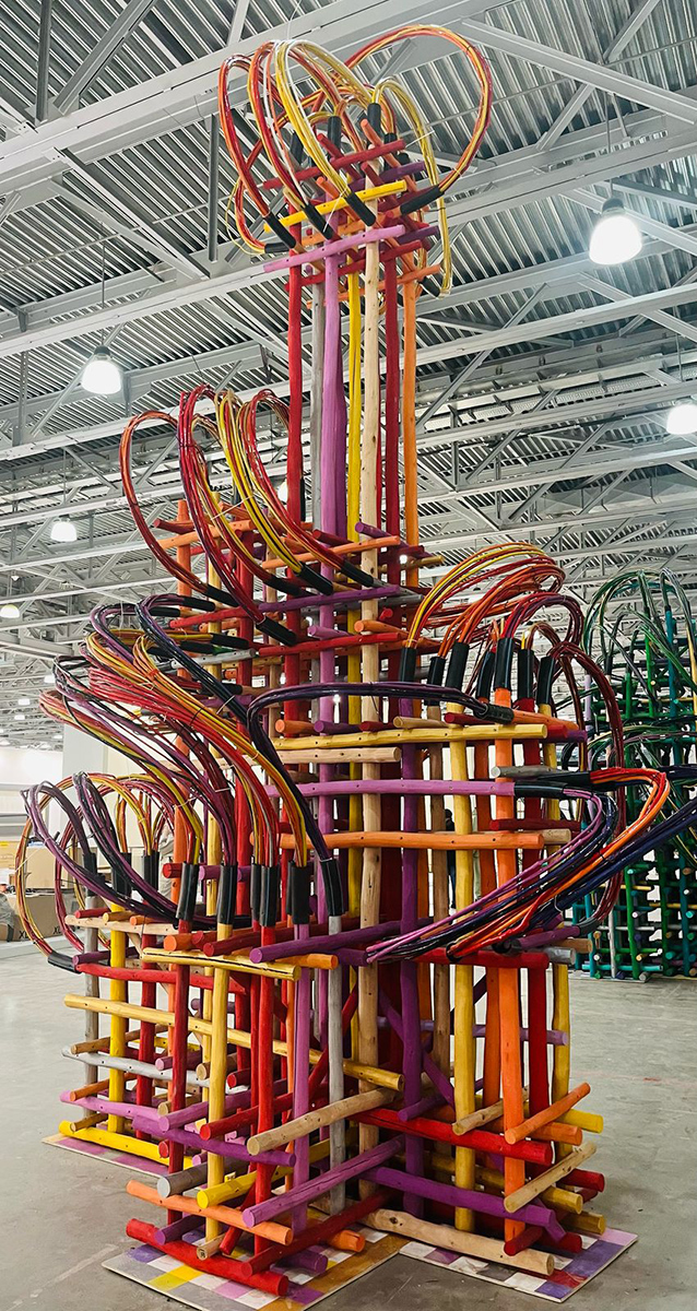 «Электроарт» — редкий пример работы художника с музейным пространством: проект был впервые представлен публике в Мультимедиа Арт Музее в 2024 году при поддержке фонда Прометей. Монументальные псевдотехнологические объекты, состоящие из прутьев лозы и деревянных модулей, формируют «техногенную экосистему», пластическую метафору современного мегаполиса.